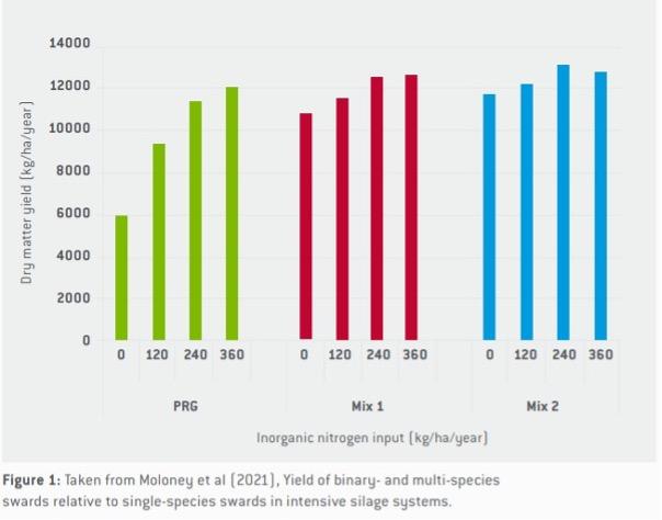 Multi-species swards have the potential to produce high yields of quality forage at greatly reduced rates of nitrogen fertiliser input.