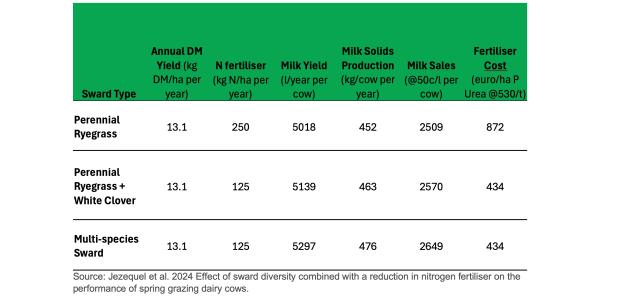 A beef systems trial at Teagasc Grange found no difference in animal performance between multi-species and grass-white clover swards when animals were slaughtered at 19, 23 or 26 months. Both of these swards received similar N fertiliser and there was no pure perennial ryegrass treatment so the fertiliser savings could not be detected in this study.
