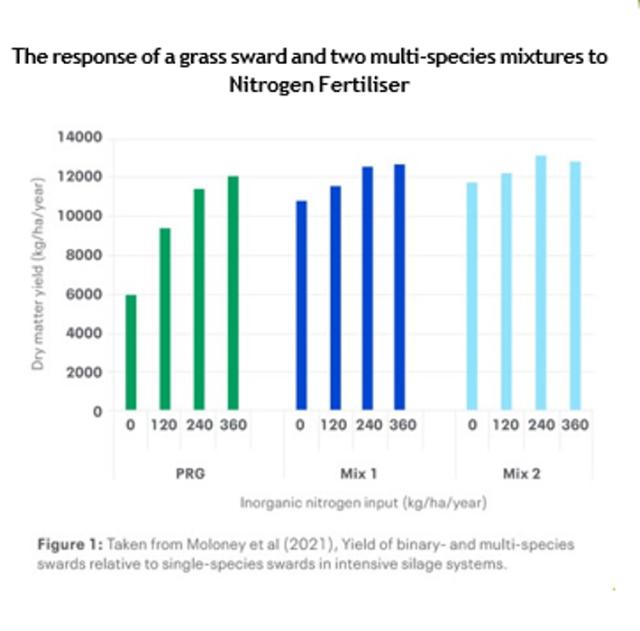 The data below from Teagasc Grange clearly shows how multi-species swards receiving zero kg of N fertiliser produced the same tonnage as a grass sward receiving 240kg N/ha per year.